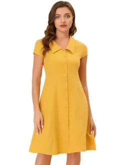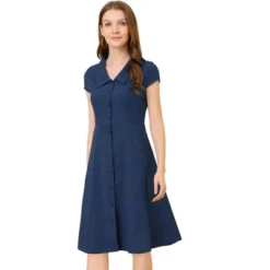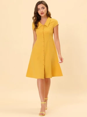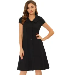 Featuring a button-down finish, this shirt dress is perfect for both formal and casual occasions. The midi length and short sleeves are comfortable and elegant. Made of soft cotton material, this short-sleeved button-up dress ensures you’ll stay comfortable all day long, making it a stunning addition to your modern wardrobe without hesitation. The collar and short sleeves add elegance to your casual or formal look. Fastened with buttons, this dress features an A-line silhouette with a pointed collar, a fitted waist, and a flared hem for an effortlessly elegant silhouette.