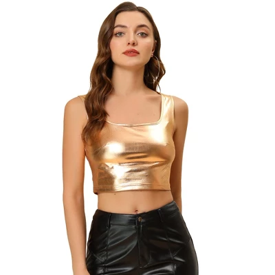 The shiny metallic crop top can be added to your party collection. It is suitable for parties, clubs, cocktails, nights out, and gatherings! The fashionable style highlights your torso well and shows your shoulders at the same time. The perfect eye-catching sleeveless crop top with metallic shining, allows you to shine on the night of the party.