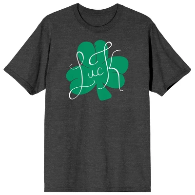 Show off your lucky side with this St. Patrick’s Day tee. The shirt features an image of a three-leaf clover with white letters that spell out, “Luck.” The tee comes in a charcoal heather short sleeve crew neck. Celebrate St. Paddy’s Day in style with this comfy t-shirt.