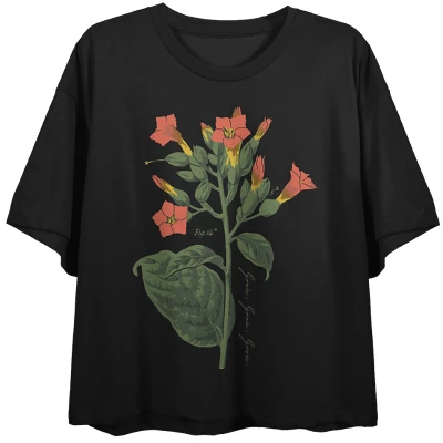 Celebrate your favorite plants with this Vintage Botanical crop t-shirt. The shirt features an image of a cigar plant with colorful red flowers. The tee comes in a black short sleeve crop top. Cigar Plant fans will love this comfy crop tee.