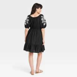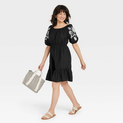 Bring sweet style to your wardrobe with this Puff 3/4 Sleeve Embroidered Dress from Knox Rose™. A round neckline and flattering waistline frame this mini dress in a solid hue with elastic-cinched shirred details and a ruffled hem for added flair. While the contrast-color embroidered floral accents on the three-quarter sleeves elevate the look, the side pockets lend you hands-free convenience when you’re out and about. Plus, the lightweight cotton-blend construction makes it comfortable to wear.