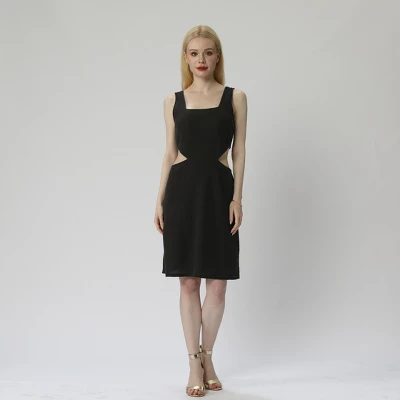 Solid-color slim fit dress with square neckline. Waist keyhole design with wide straps. Made from elastic knit fabric for comfortable wear that moves with you. Bodycon/pullover style complete the look.