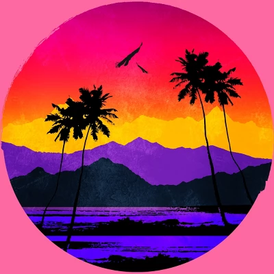 - This beautiful summer design features the silhouette of a palm tree beach at sunset, with a colorful mountain landscape while birds fly high.