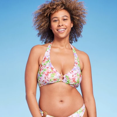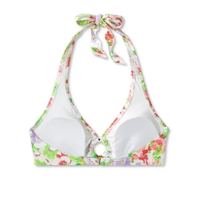 This Multi Floral Print Halter Center Front Ring Bralette Bikini Top from Shade & Shoreâ„¢ brings colorful, botanical charm to your beachwear. It’s detailed with a gold-tone metal ring accent at the center for a chic touch of shine. Made from soft and stretchy opaque fabric, it offers flexible comfort whether you’re swimming or lounging on the shore. The back with a hook and adjustable tie closure helps you find a custom fit, and the removable cups offer customizable coverage.